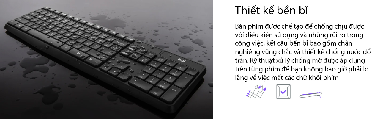 Thiết kế chống nước đổ tràn 1Được kiểm nghiệm trong điều kiện giới hạn (tối đa 60 ml chất lỏng đổ tràn). Không được nhúng bàn phím vào chất lỏng.