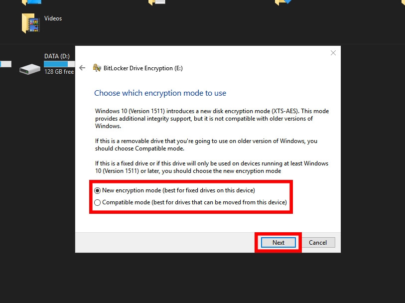 Bước 5: Nếu máy tính của bạn dùng Windows 10 phiên bản 1511 trở lên thì click chọn New encryption mode.