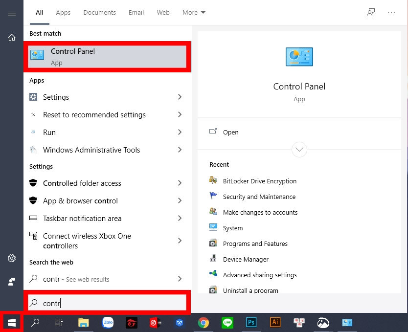 Bước 1: Mở menu Start, nhập vào control panel rồi click vào kết quả tương ứng vừa hiện ra.