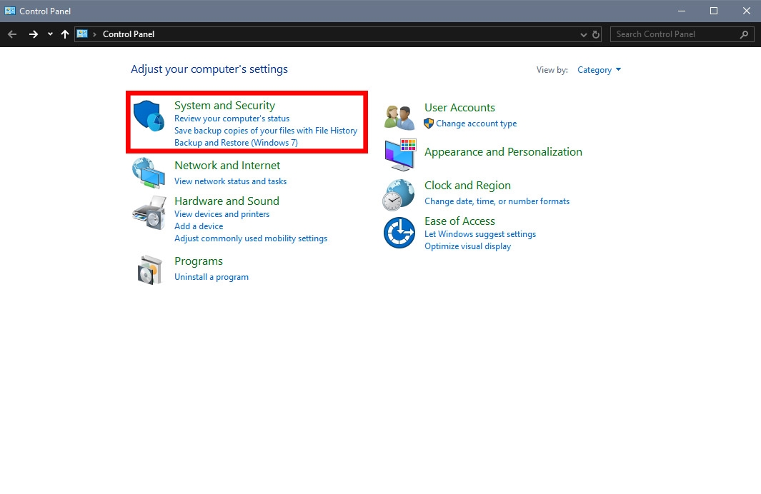 Bước 2: Trong cửa sổ Control Panel, click chuột vào mục System and Security.