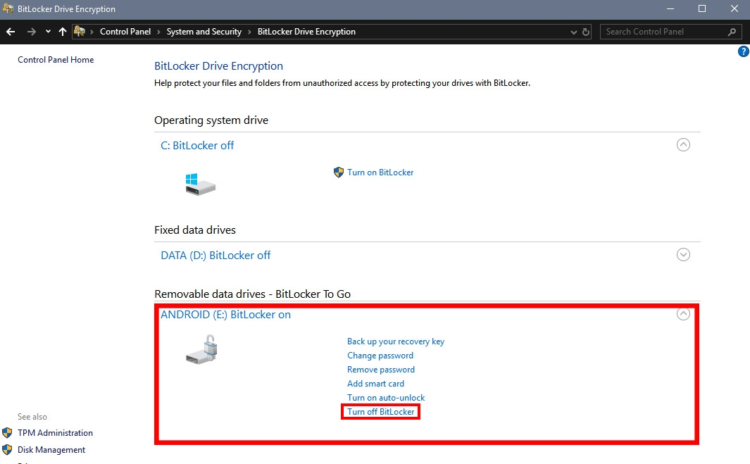 Bước 4: Click chọn USB đã mã hóa rồi click vào mục Turn of BitLocker là xong.