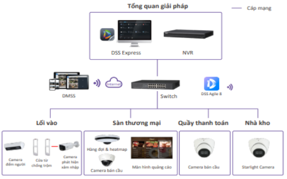 | Phần mềm quản lý tổng thể | DSS Express V8 | . Quản lý hệ thống kiểm soát ra vào . Quản lý hệ thống CCTV . Xem trực tiếp, xem lại, Cảnh báo … . Hỗ trợ app DSS Agile 8 trên điện thoại |