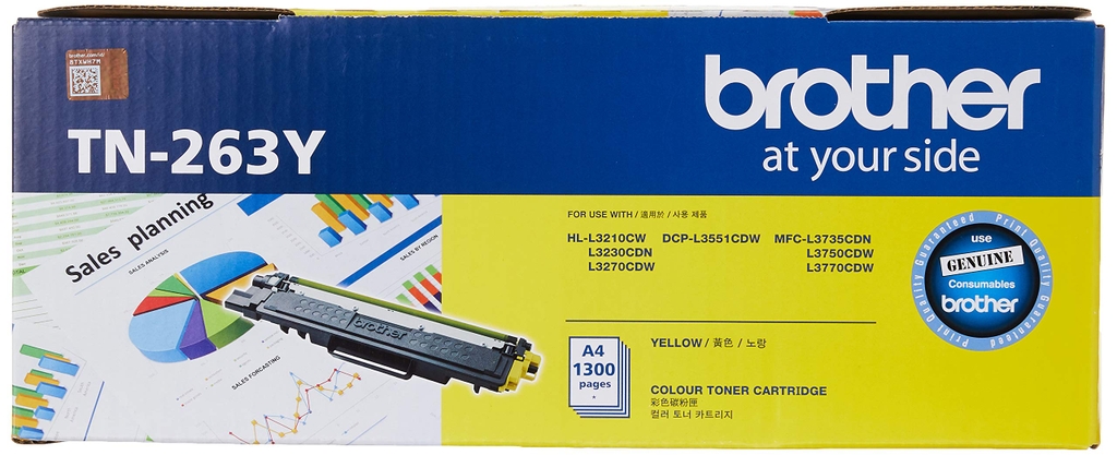 TN-263Y là mã của hộp mực (toner cartridge) laser màu vàng (Yellow) chính hãng của hãng máy in Brother.