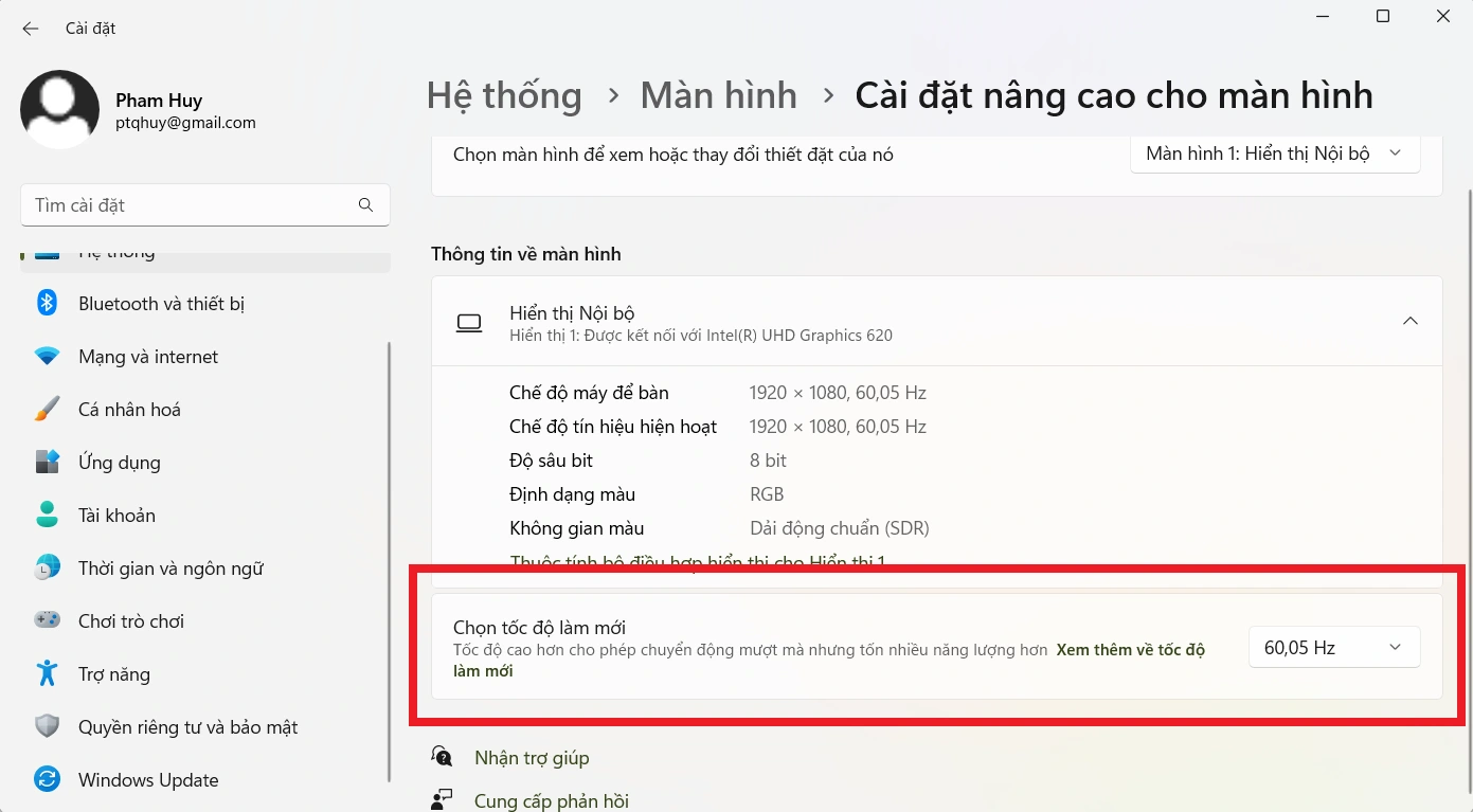 - Tại giao diện tiếp theo, bạn tìm mục "Chọn tốc độ làm mới", sau đó giảm tần số quét của màn hình laptop để tiết kiệm pin trên sản phẩm. Trong trường hợp bạn không thể hạ tần số quét, nghĩa là laptop đang sử dụng không hỗ trợ tính năng điều chỉnh tần số quét trên màn hình.