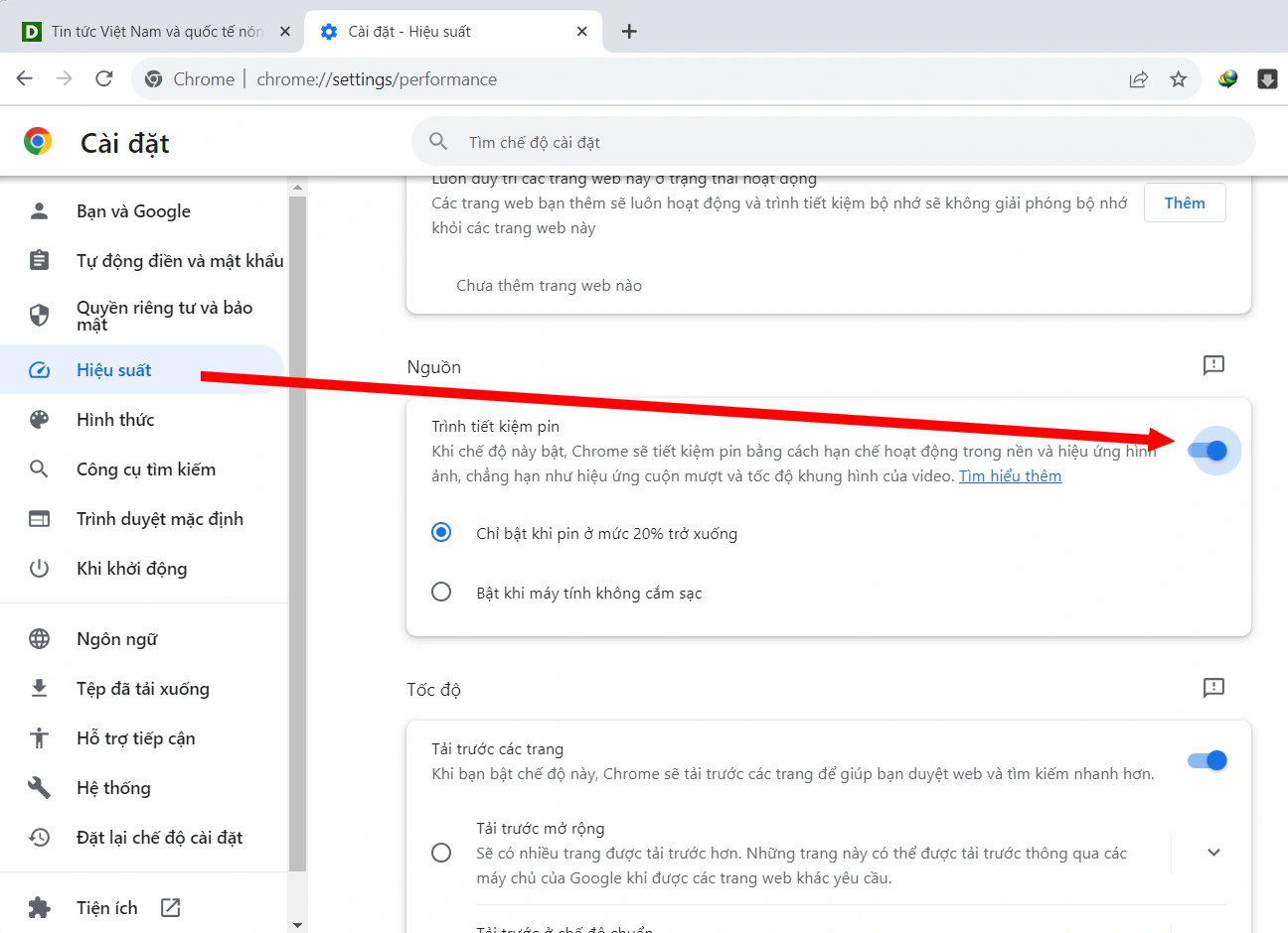 - Tại giao diện tiếp theo, bạn chọn mục "Hiệu suất" (Performance) ở menu bên trái. Bây giờ, bạn kích hoạt tính năng "Trình tiết kiệm pin" trên trình duyệt Chrome, sau đó tùy chọn kích hoạt tính năng này khi dung lượng pin trên laptop xuống mức 20% hoặc mặc định kích hoạt ngay khi laptop sử dụng nguồn pin.