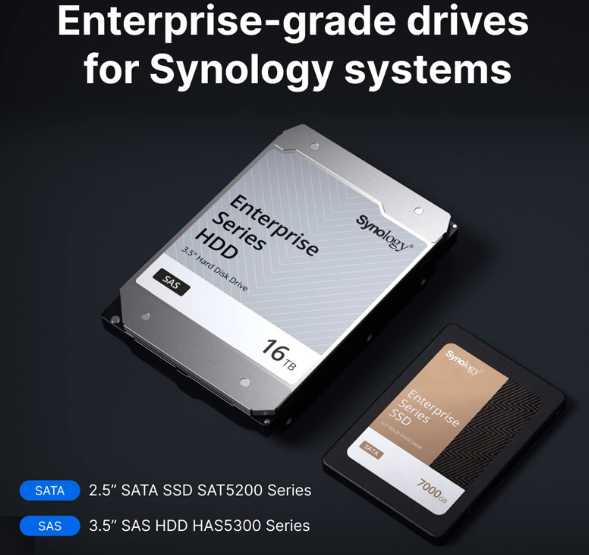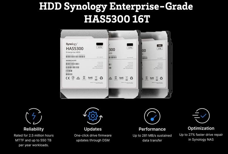 với 16TB dung lượng. Dòng ổ cứng cấp doanh nghiệp này cho phép tốc độ truyền dữ liệu liên tục lên đến 281 MB/giây, phù hợp để triển khai các tác vụ sao lưu, đồng bộ hoặc chia sẻ các thư mục dữ liệu, tập tin hệ thống, bản ghi an ninh có dung lượng lớn. Synology HAS5300 16T được phát triển trên chương trình cơ sở được tối ưu hóa tốt, phục vụ cho những công việc lưu trữ dữ liệu quan trọng cấp doanh nghiệp. Dòng ổ cứng Synology HAS5300 cho phép các hệ thống lưu trữ của Synology có thể sửa chữa các mảng RAID đã xuống cấp nhanh hơn gấp 27% so với các loại ổ đĩa cùng loại, cùng dung lượng. Chi tiết về dòng sản phẩm này, bạn đọc hãy cùng tham khảo trong các phần nội dung sau!