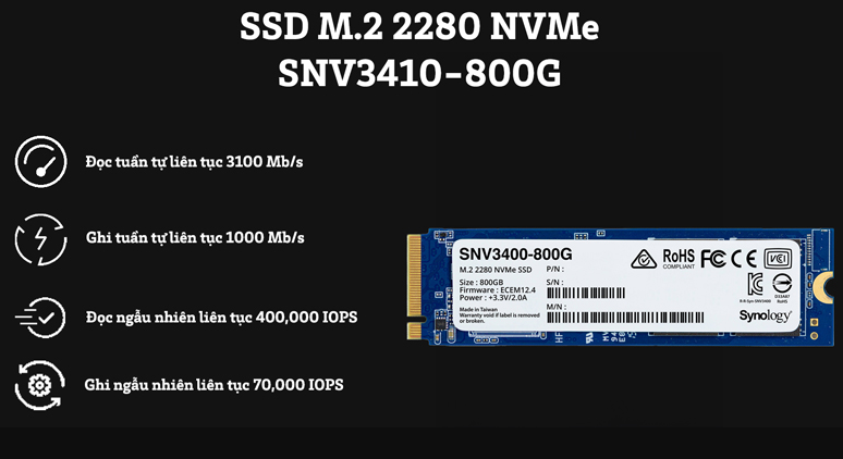 Ổ cứng SSD Synology 800G M.2 2280 NVMe (SNV3410-800G) là một mẫu ổ cứng Nas có dung lượng vượt trội trong việc lưu trữ dữ liệu. Với dung lượng lưu trữ lên đến 800GB, cung cấp không chỉ một không gian lưu trữ thoải mái mà còn đảm bảo tốc độ xử lý nhanh chóng đem lại hiệu suất cao. Bạn đọc hãy tham khảo chi tiết của sản phẩm thông qua bài viết dưới đây!
