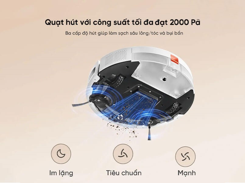 Công suất hút cao giúp loại bỏ bụi bẩn cứng đầu và lông thú hiệu quả. Robot có 3 chế độ hút: mạnh, tiêu chuẩn và im lặng, phù hợp với nhiều bề mặt và môi trường khác nhau.