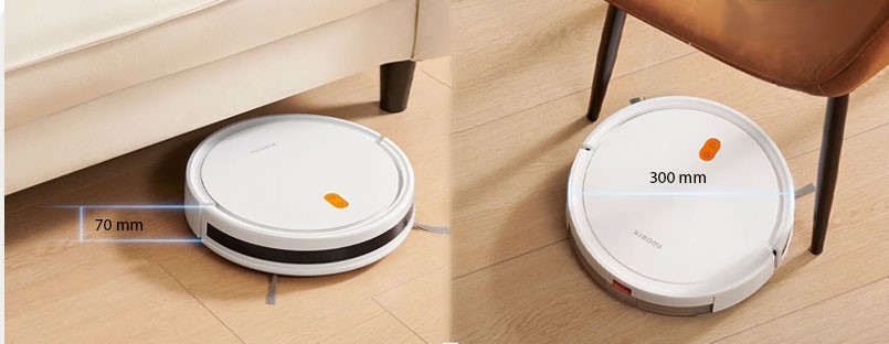 Với kích thước 300 x 70 mm và trọng lượng chỉ 2.3 kg, Xiaomi Vacuum E5 dễ dàng tiếp cận những khu vực hẹp như dưới gầm giường, sofa, tủ thấp. Thiết kế mỏng giúp robot làm sạch toàn diện ngay cả các vị trí khó tiếp cận.
