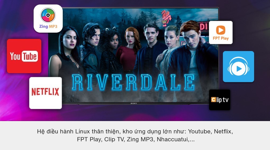 Tivi Sony có giao diện sử dụng khá đẹp mắt, thao tác nhanh chóng cùng nhiều ứng dụng sẵn có như YouTube, Netflix, Trình duyệt, Fim+, Clip TV, FPT Play, Zingmp3, Nhaccuatui,... mang đến thế giới giải trí đa dạng về căn phòng bạn ngay trên một chiếc tivi.