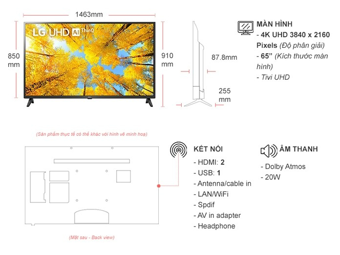 Smart Tivi LED LG 4K 65 inch 65UQ7550PSF sở hữu độ phân giải 4K (3840 x 2160 pixels), mang đến chất lượng hiển thị cao gấp bốn lần so với Full HD. Giờ đây, người dùng có thể được trải nghiệm chất lượng hình ảnh trung thực, màu sắc sống động đến từng điểm ảnh.