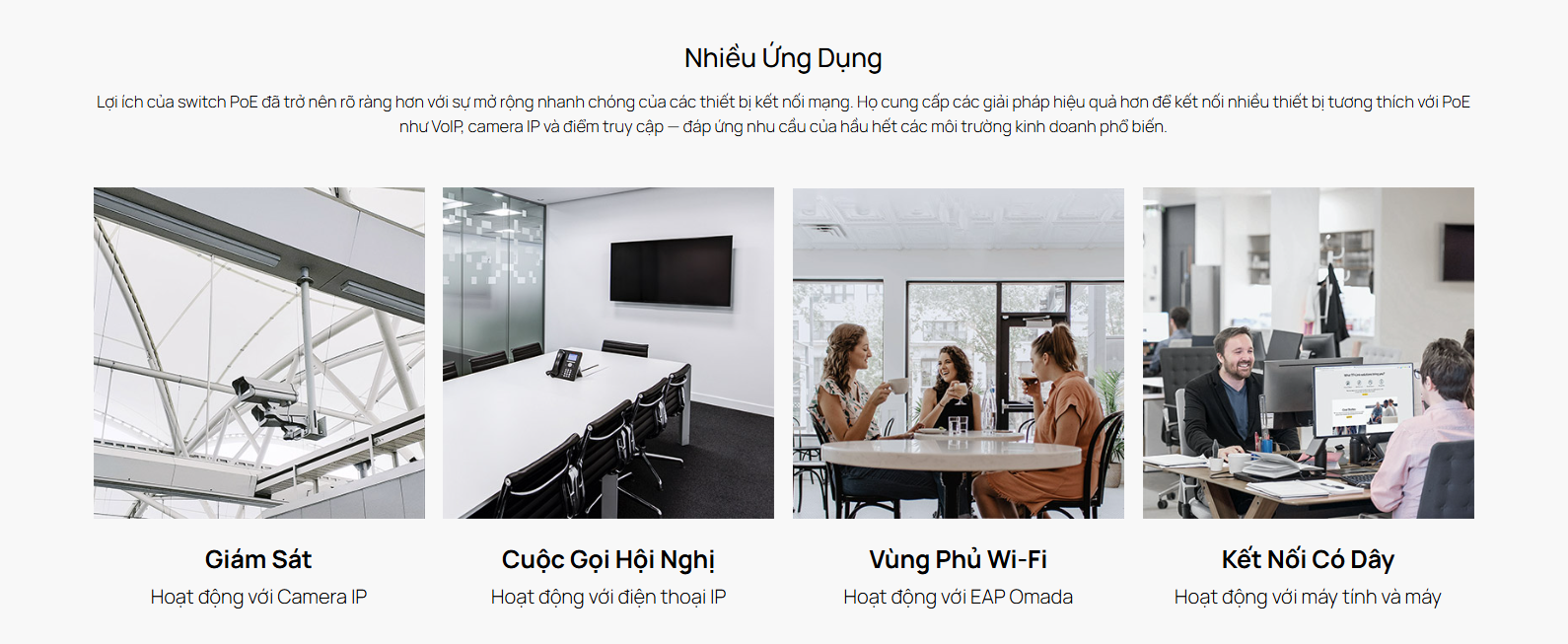 Giải pháp giám sát (CCTV): Với các cổng PoE+, switch này có thể cấp nguồn cho các camera IP mà không cần phải lắp đặt thêm bộ cấp nguồn riêng biệt.
