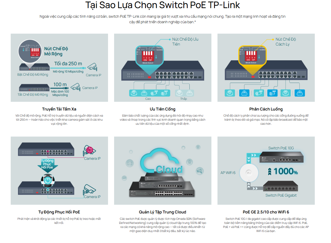 Tóm lại, switch này rất phù hợp cho các mạng doanh nghiệp, hệ thống camera, mạng nội bộ tốc độ cao hoặc các ứng dụng yêu cầu nhiều băng thông và quản lý chi tiết mạng.